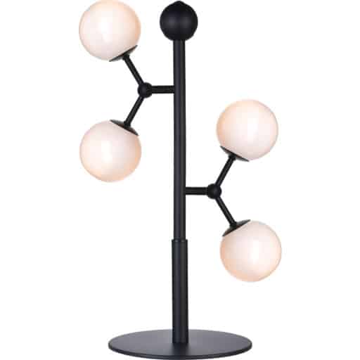 Atom bordlampe med glaskugler Du kender måske Atom lamperne som hængelamper, som i dag findes i flere modeller. Her er den længe ventede – og super flotte – Atom bordlampe med smukke røgfarvede, mathvide og ravfarvede glasskærme som giver et dejligt lys.